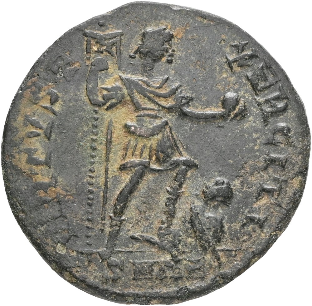 AE bronze maiorina, DN VALENTINI ANVS P F AVG, diademed, draped bust to right, rev. VIRTVS E XERCITI Valentinian in military attire standing right holding standard and globe, his left foot set on captive, SMNB in exergue.