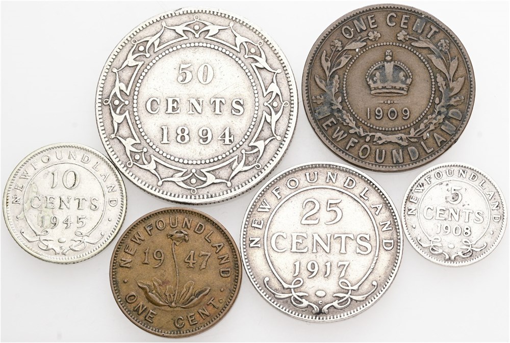 1 Cent 1909, 1947; 5 Cents 1908; 10 Cents 1945; 25 Cents 1917; 50 Cents 1894. (6)