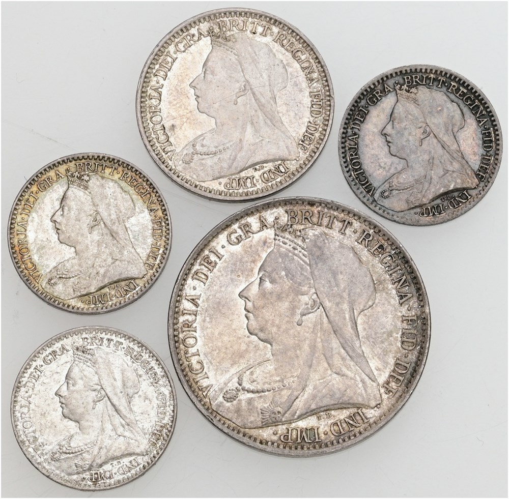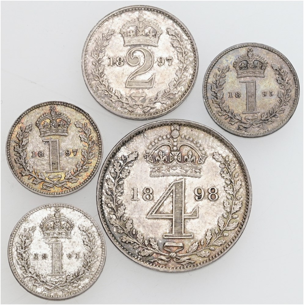 Collection of Maundy Coins, 5 pcs - Penny 1895, 1897, 1901, Twopence 1897, and Fourpence 1898. (5)