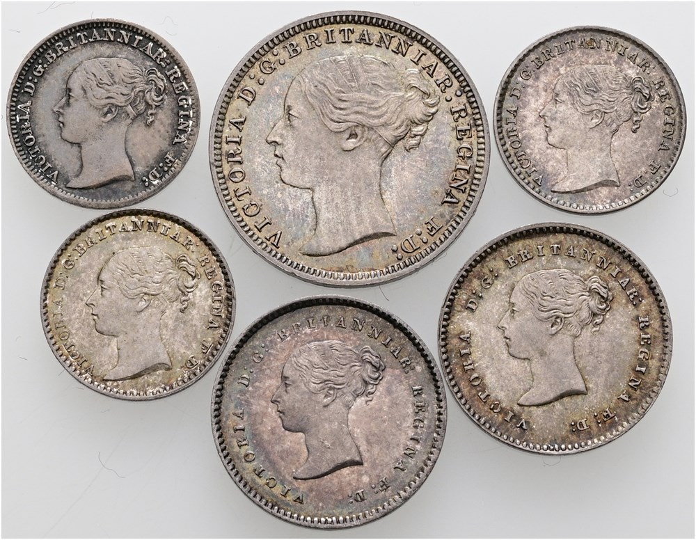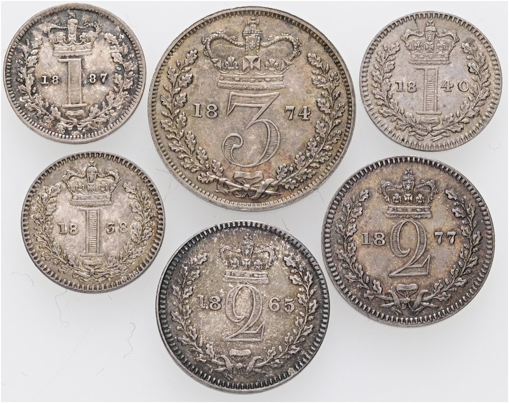 Collection of 6 Maundy coins, Threepence 1874, Twopence 1855, 1877, Penny 1838, 1840, 1887. (6)