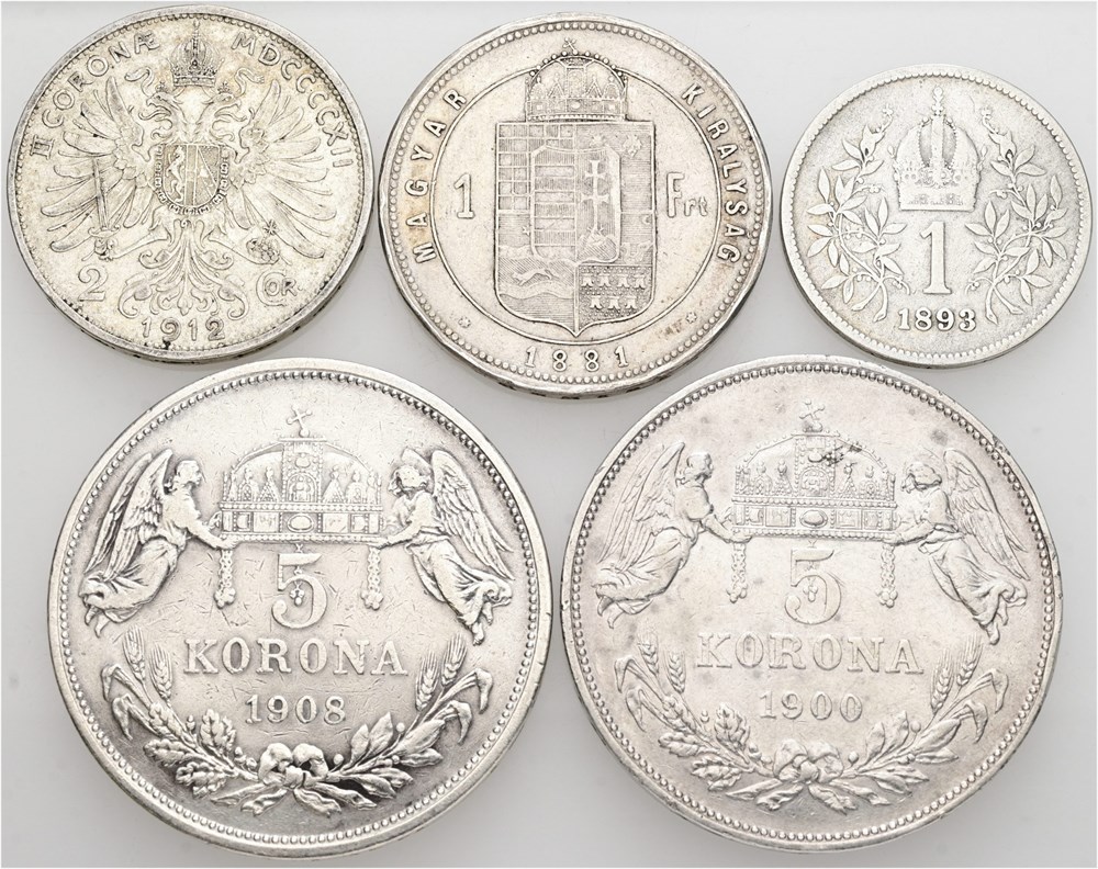 Hungary, Forint 1881; 5 Korona 1900, 1908; Austria, Corona 1893; 2 Corona 1912. (5)