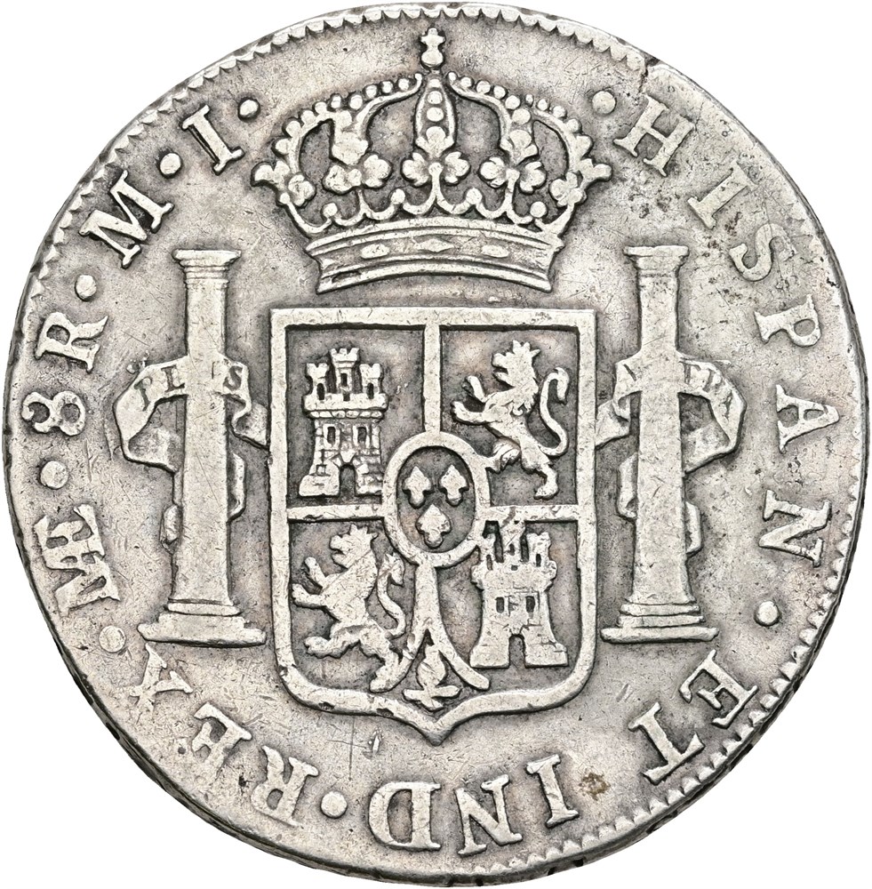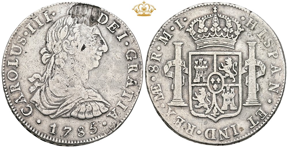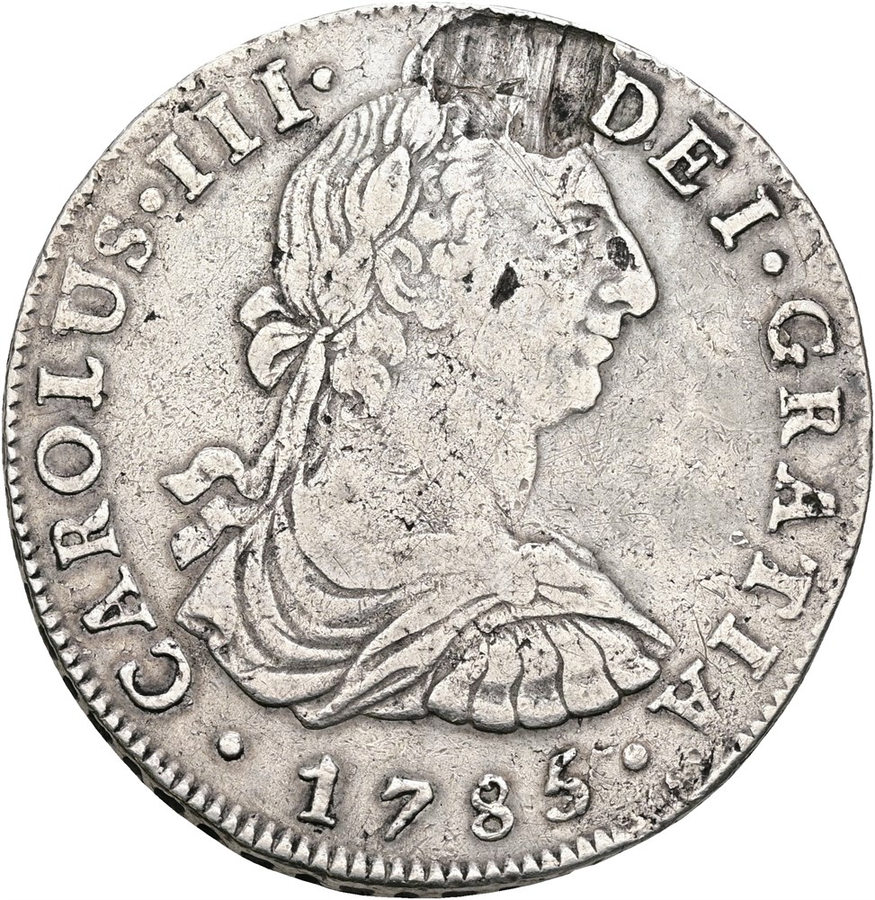 8 Reales 1785 Mo MI, planchet flaw, scratches.