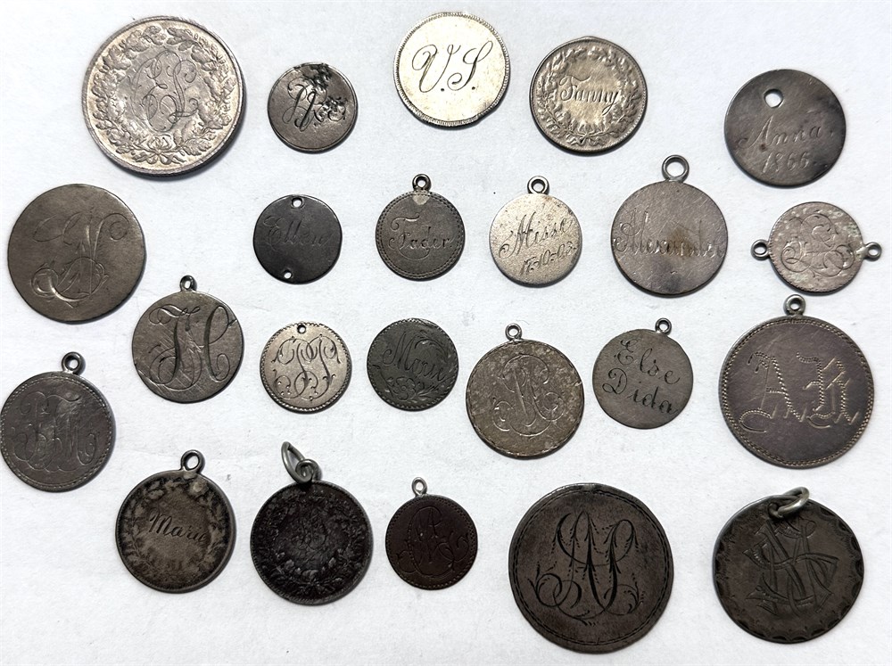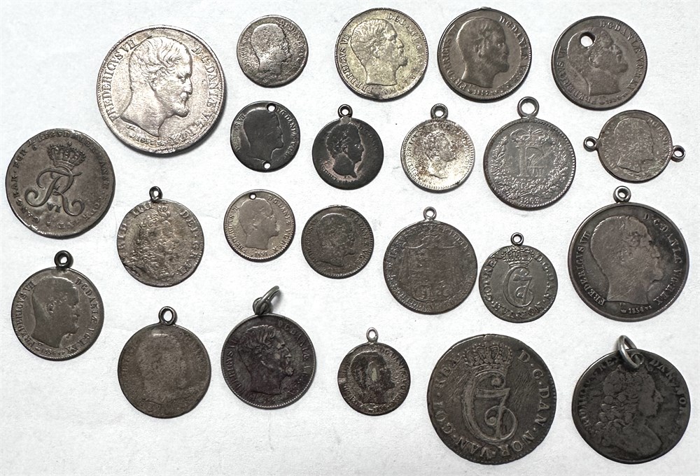 Samling love-tokens inkl. Frederik IV, 16 skilling; Christian VII, 24 skilling; Frederik VI, 1/6 rigsdaler 1808, 'offermark'; Frederik VII, 1/2 og 1 rigsdaler 1854. I alt 23 stk.