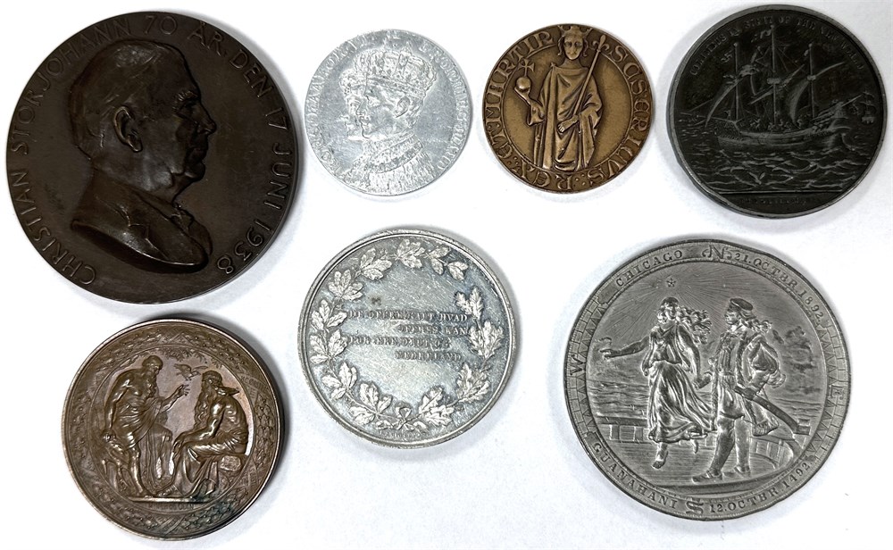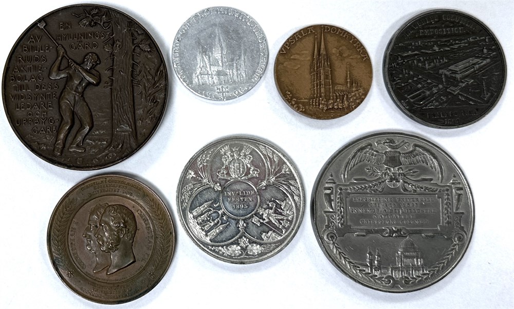 Samling medaljer af uædelt metal, Danmark, Københavns Universitets 400-års jubilæum, 1879, 52 mm; Verdensudstillingen i Chicago, 1893, 65 mm; invalidefesten, 1895, 52 mm; Norge, kroningen, 1906, 40 mm; Sverige, Christian Storjohann, 1938, 70 mm; Uppsala Domkirke, u. år, 40 mm; USA, verdensudstillingen i Chicago, 1893, 50 mm. (7)