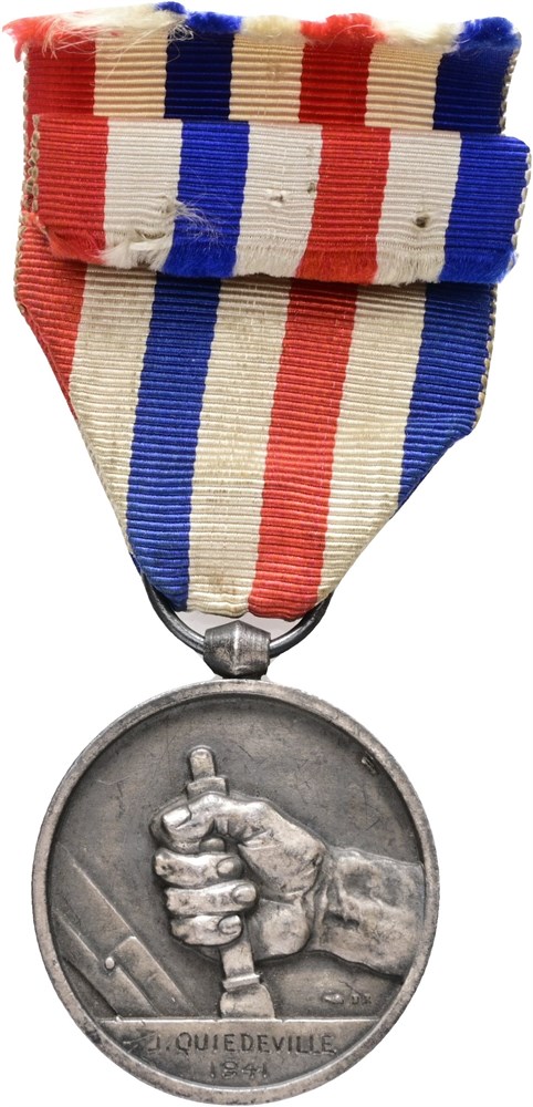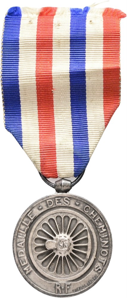 Honour medal of railroads, "Médaille des cheminots", silvered Ae, 32 mm, with ribbon but without pin, awarded to J. Quiedeville in 1941