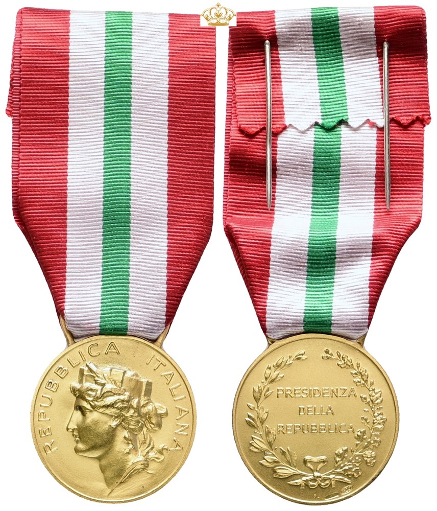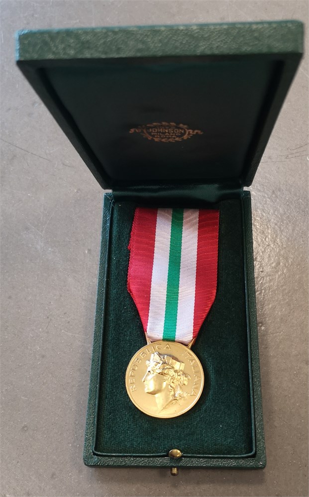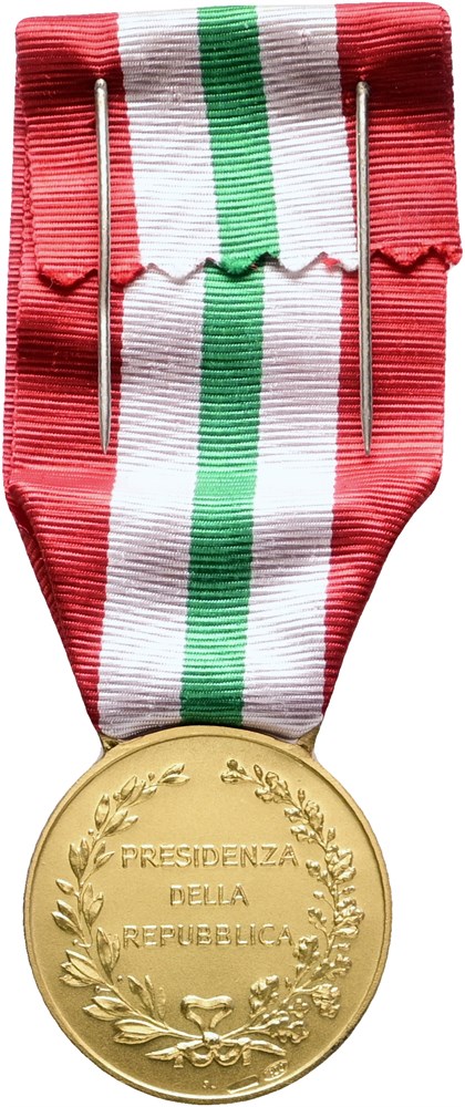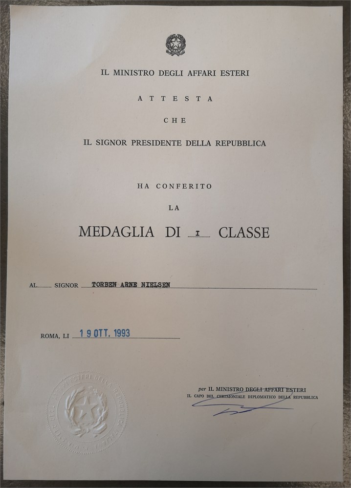 President Medal, First Class / 'Presidente Della Repubblica, Medaglia di I Classe', gilt Ag, 31 mm - with original ribbon, box of issue, and award document. Awarded to Torben Arne Nielsen, 19 October 1993.
