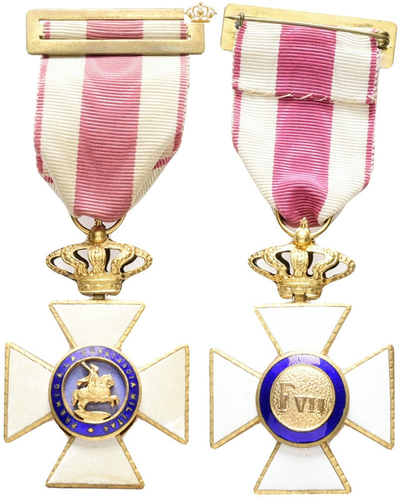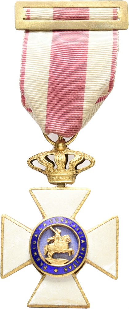 Royal and Military Order of Saint Hermenegild, cross, gilt and enameled Ae, 55x37 mm, with ribbon.