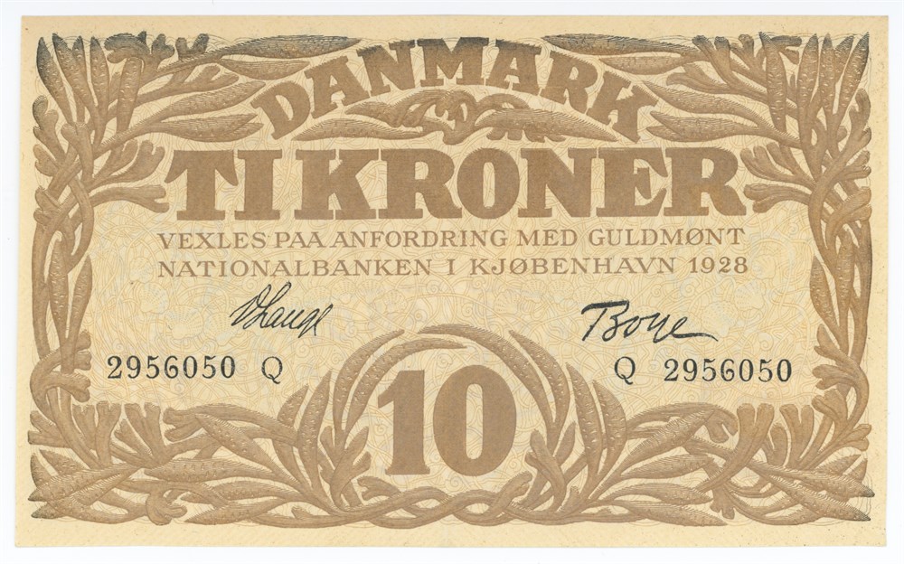 10 kroner 1928 Q, nr. 2956050, V. Lange / Boye.