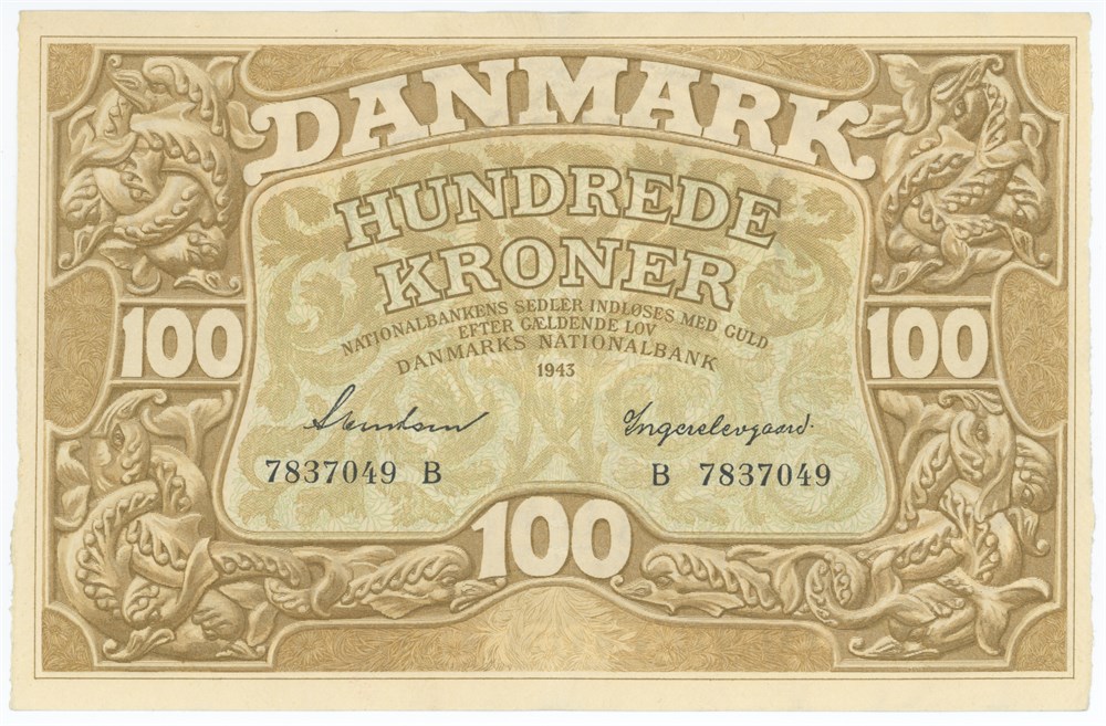 100 kroner 1943 B, nr. 7837049, Svendsen / Ingerslevgaard.