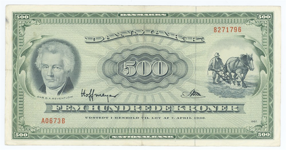 500 kroner 1967 A0, nr. 8271796, Hoffmeyer / Riim, lille misfarvning i venstre margin.