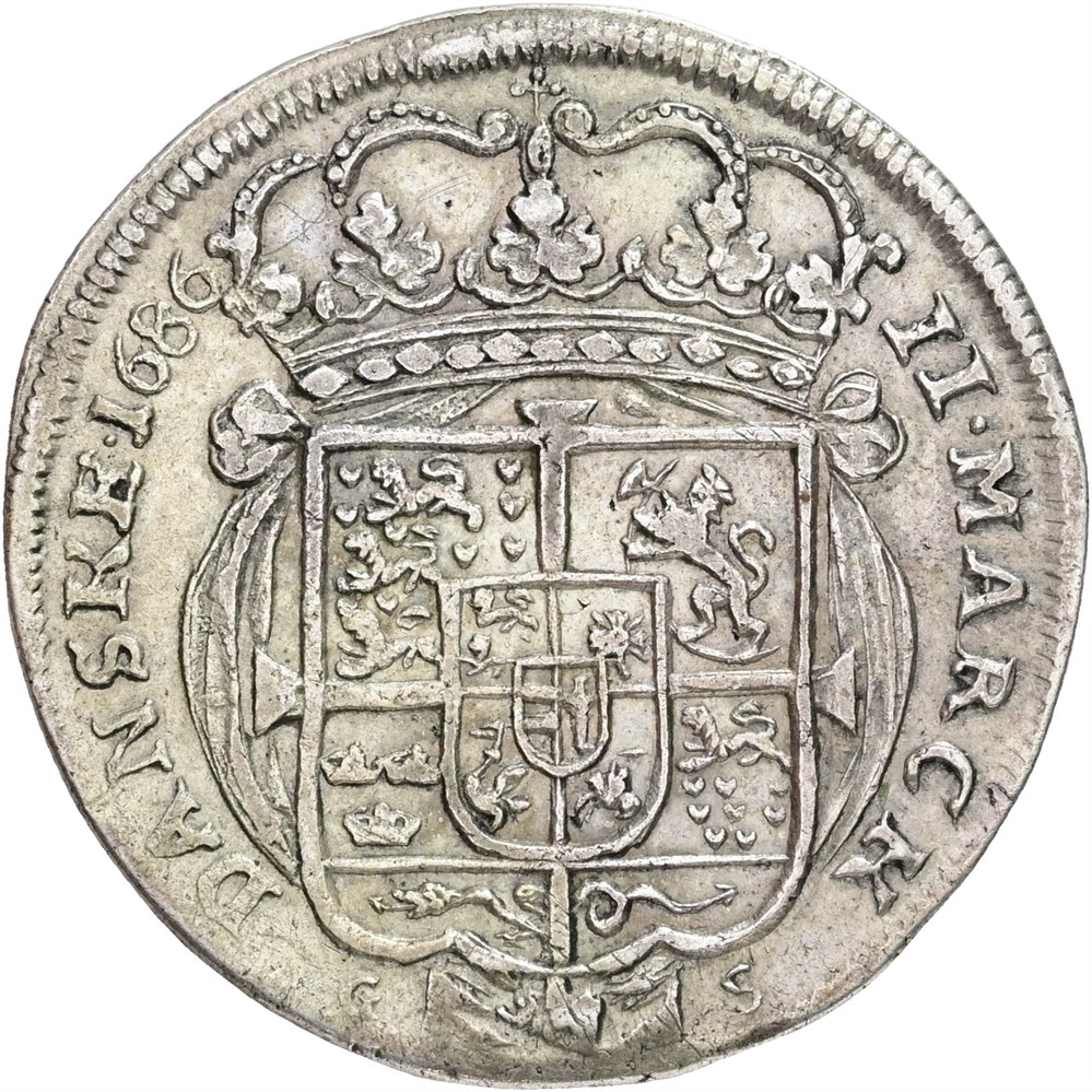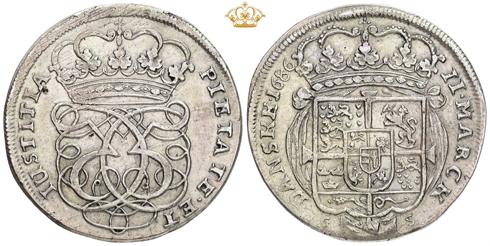 2 mark 1686, plet fjernet i højre felt på forsiden, ellers ganske nydelig med skarpt monogram.