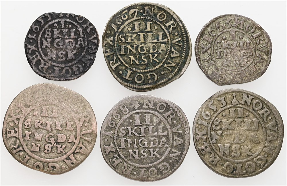Skilling 1655, 1663 samt 2 skilling 1653, 1666, 1667, 1668. (6)