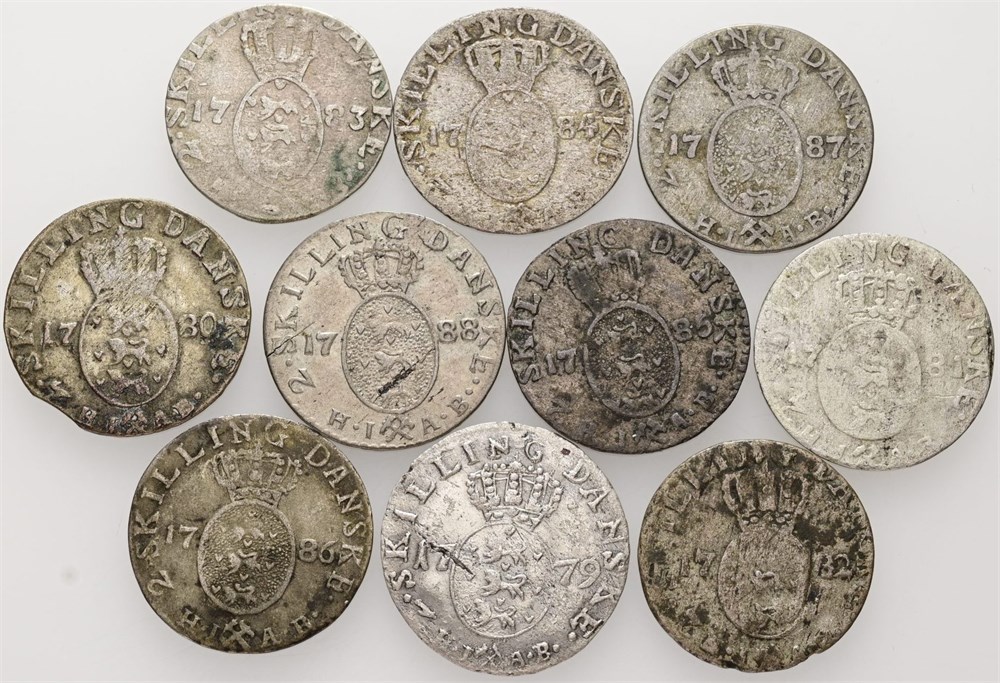 Samling 2 skilling, alle forskellige. (10)