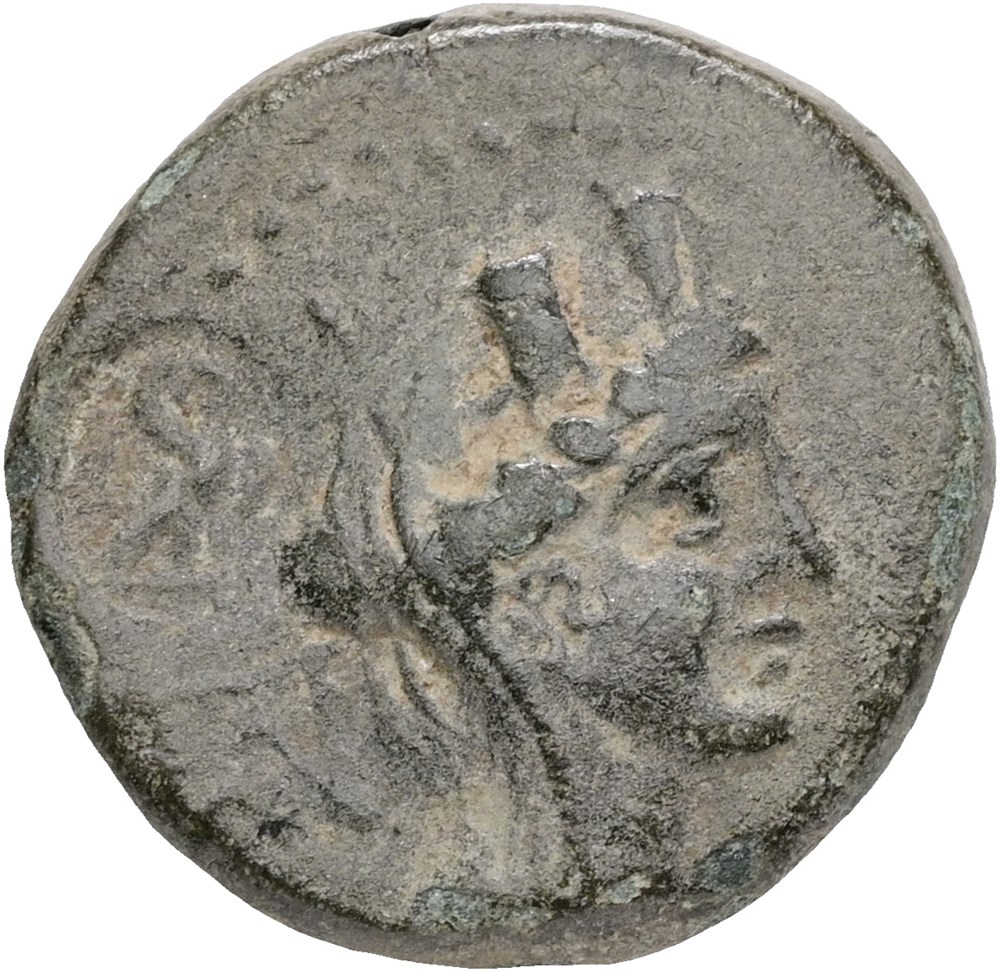 AE 22, 2nd - 1st cent. BC. Turreted, veiled, and draped bust of Tyche right; monogram behind, countermark above
