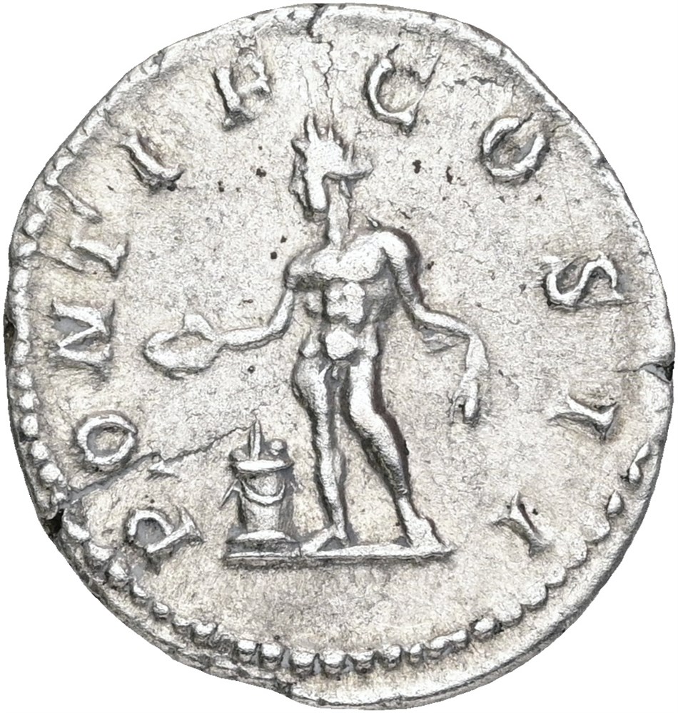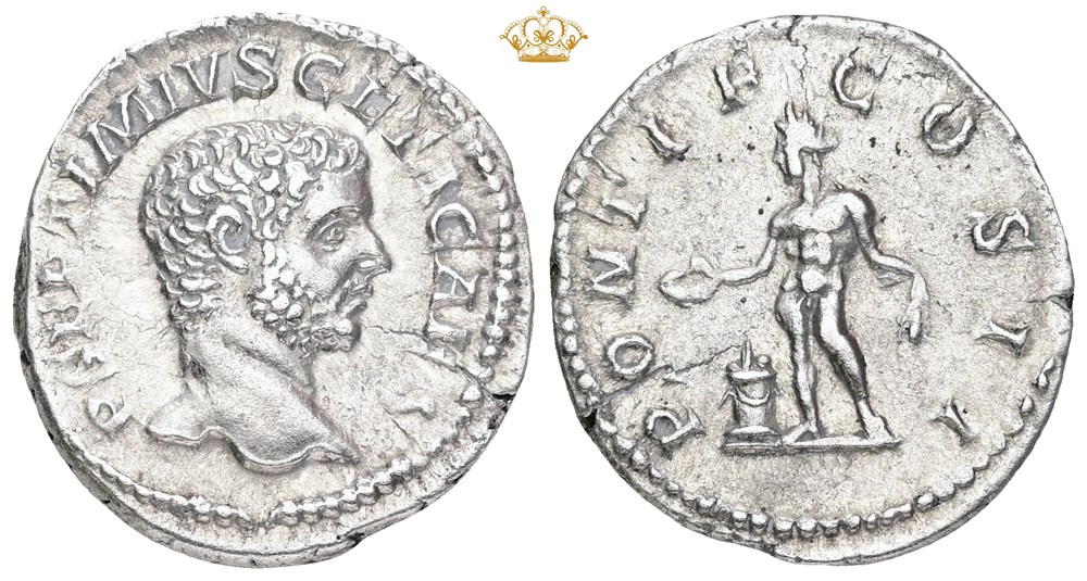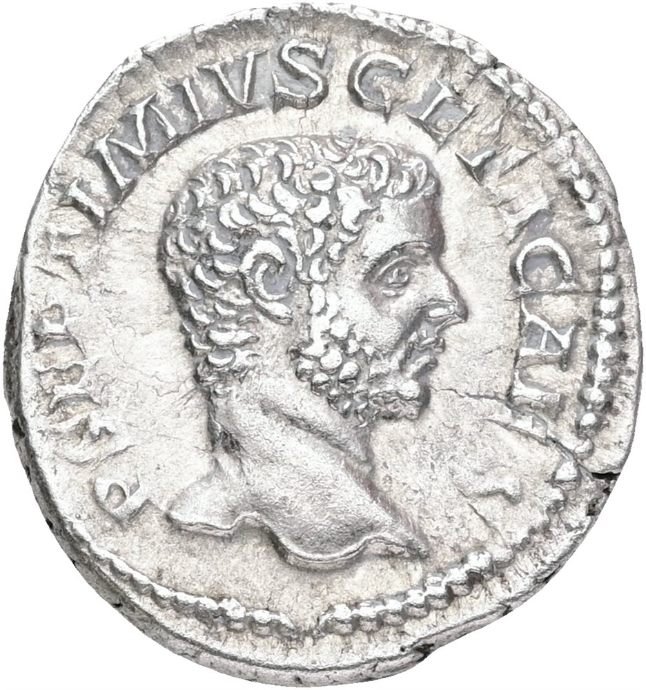 Denarius, 209 AD. P SEPTIMIVS GETA CAES / PONTIF COS II, Genius sacrificing out of patera over lit altar and holding corn-ears. Flan crack.