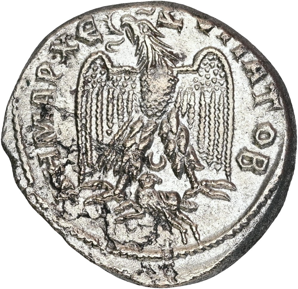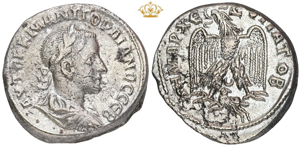 Tetradrachm. AYTOK K M ANT ΓOPΔIANOC CЄB, laureate, draped and cuirassed bust of Gordian III. Rev. ΔHMAPX YΠA TO B, Eagle standing. Cleaned.