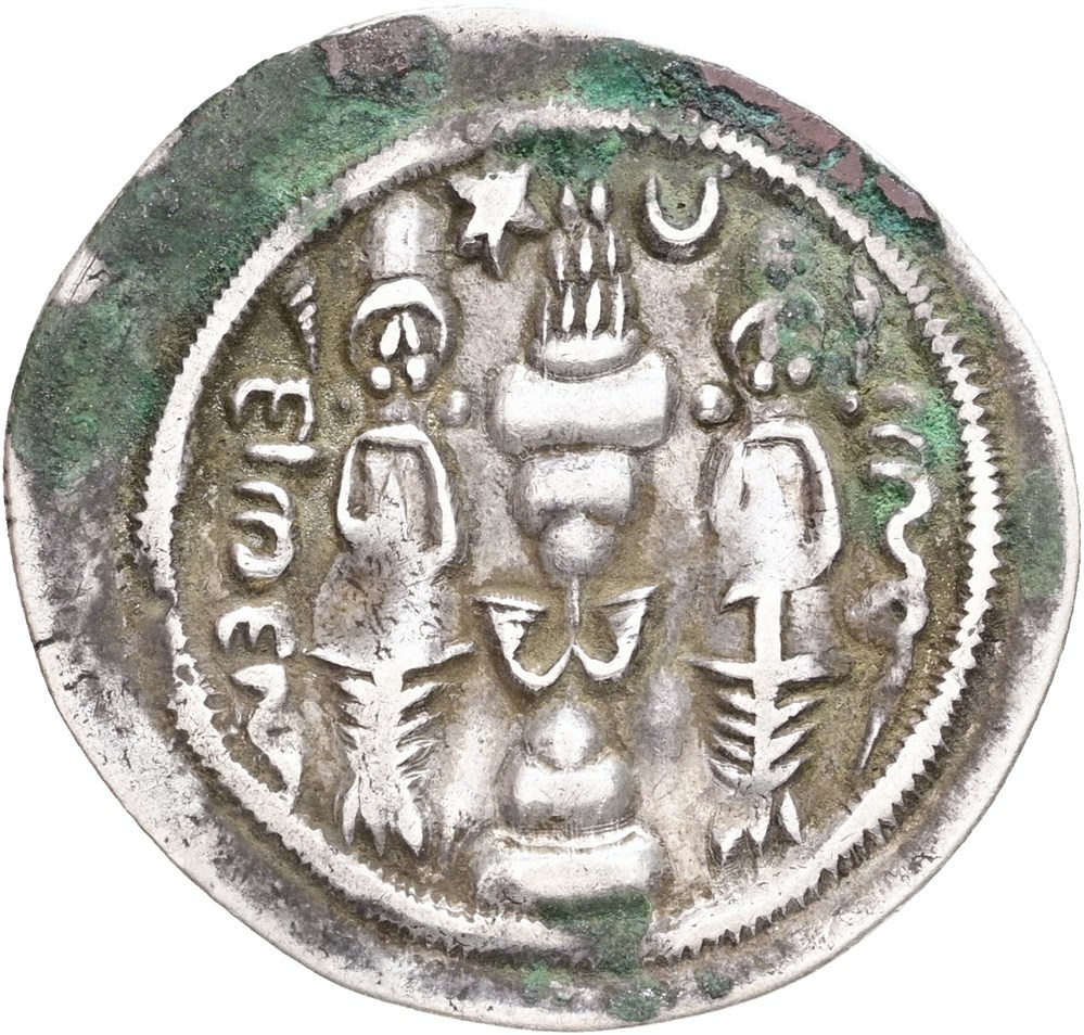 Drachm, year 12. Crowned bust right / Fire altar; attendants flanking.