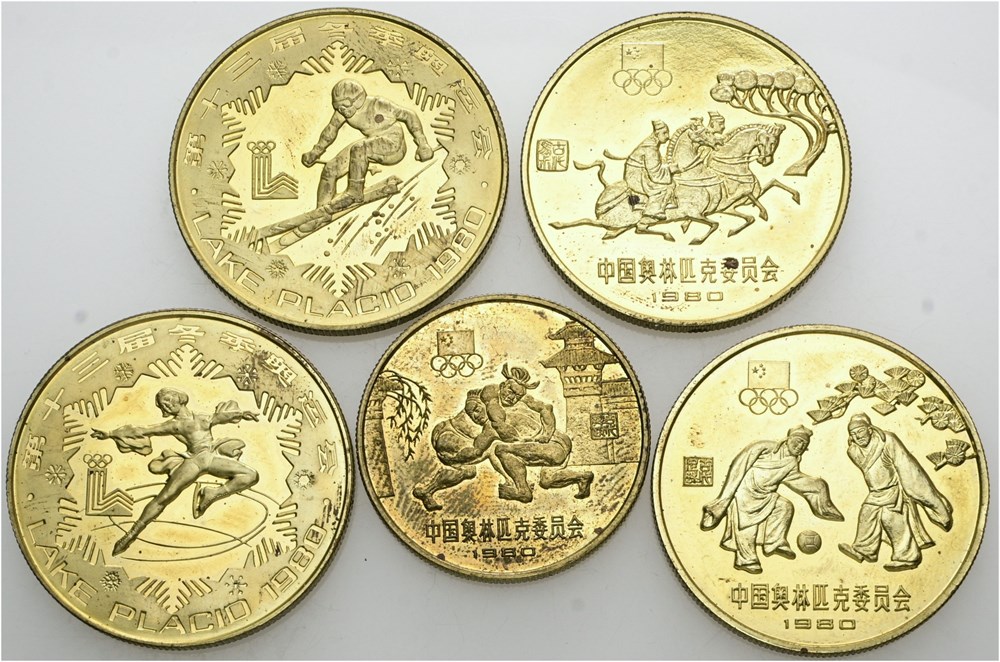 Yuan 1980, Winter Olympics, Lake Placit, 5 pcs.: 'Figure skating', 'Alpine skiing', 'Wrestling', 'Equestrian', 'Soccer', all with traces of handling. (5).