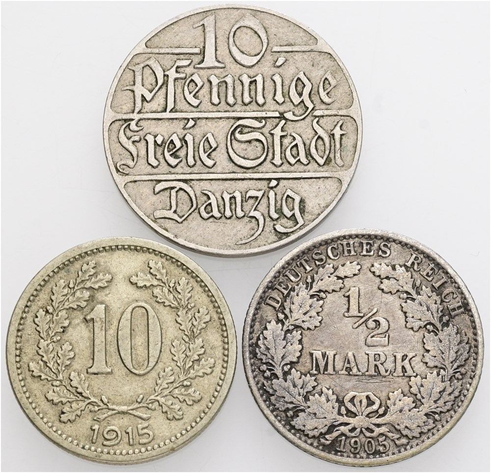Danzig, 10 Pfennig 1923; Germany, 1/2 Mark 1905 A; Austria, 10 Heller 1915. (3)