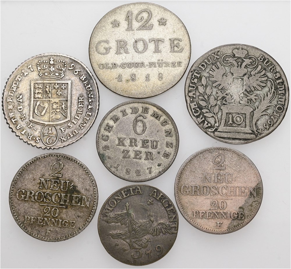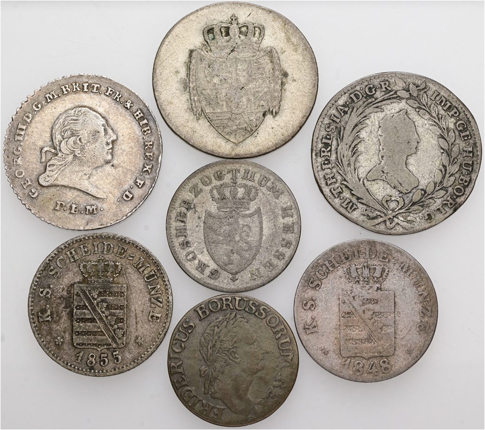 Germany, Braunschweig-Lüneburg-Calenberg-Hannover, 1/6 Taler 1796 PLM; Hesse-Darmstadt, 6 Kreuzer 1827; Oldenburg, 12 Grote 1818; Preussen, 3 Gröscher 1779; Sachsen, 2 Neugroschen / 20 Pfennige 1848, 1855; Bohemia, 10 Kreuzer 1765, Prague. (7)