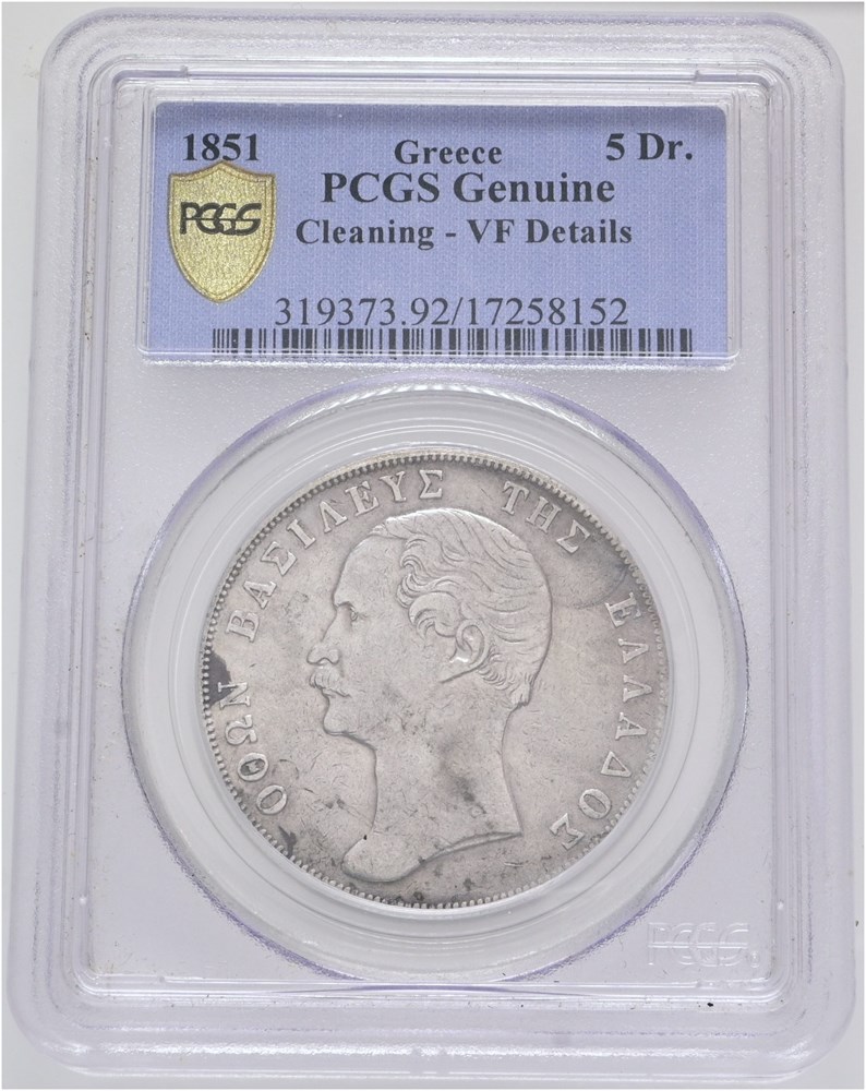 5 Drachmai 1851 - graded genuine, VF details, cleaning by PCGS.