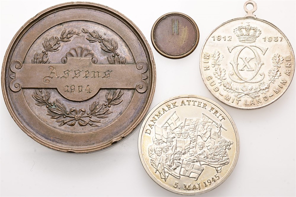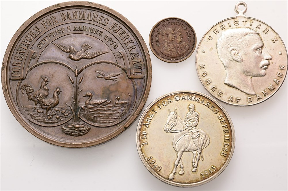 Foreningen for Danmarks Fjerkræavl, stiftet i Aarhus 1878, Assens 1904, Ae, 50 mm, 49,05 g; Frederik VIII og Dronning Louise, u. år, Ae, 17 mm, 1,28 g; Christian X's 25 års regeringsjubilæum, 1937, forsølvet Ae, 32 mm, 11,65 g; Danmarks Befrielse, 50 års jubilæum, u. år (1995), Ag (900/1000), 33 mm, 15,08 g. (4)