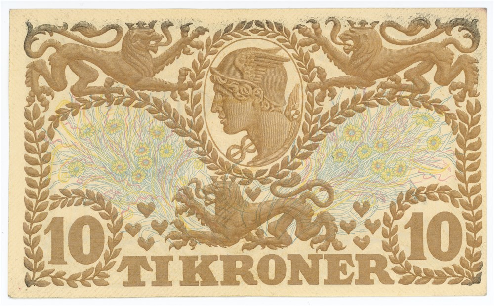 10 kroner 1934 F, nr. 1601495, V. Lange / Gjellerup. Lidt misfarve midt på advers.