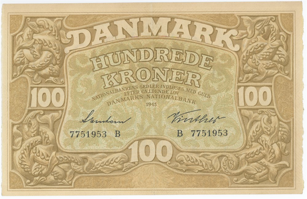 100 kroner 1943 B, nr. 7751953, Svendsen / Vinther