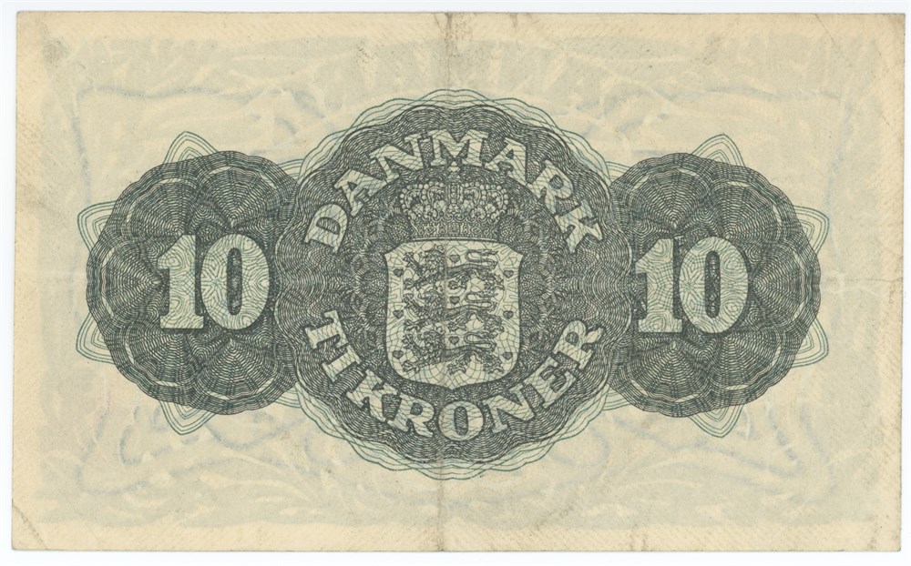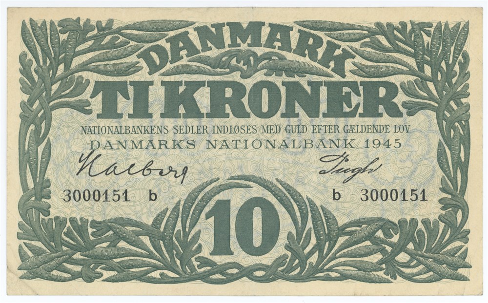 10 kroner 1945 b, nr. 3000151, Halberg / Pugh.
