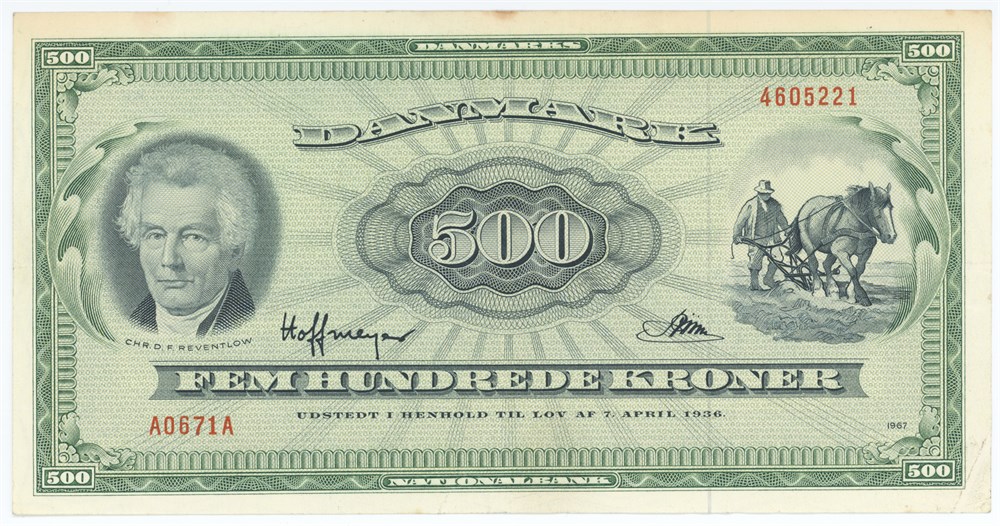 500 kroner 1967 A0, nr. 4605221, Hoffmeyer / Riim.