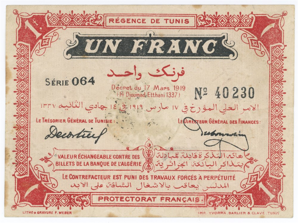 Un Franc 1919, no. 40230, pinholes, stains.