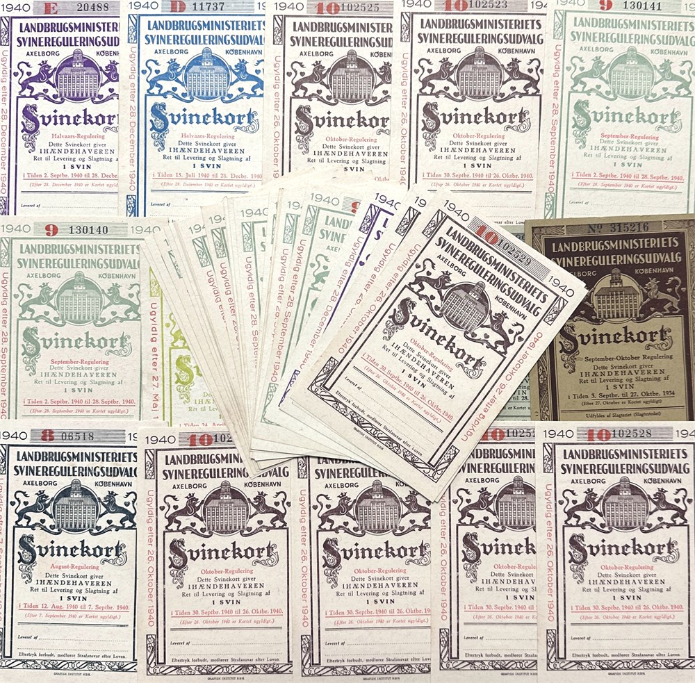 Svinekort, 1934 brun, rød, sort, 1939 gul/grøn, 1940 grøn (25), blå, mørkeblå/sort, brun (10), lilla (2). (43)