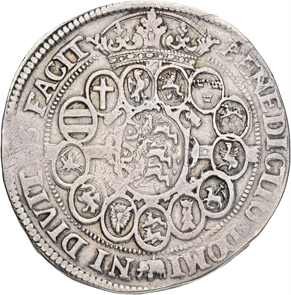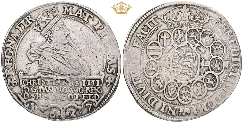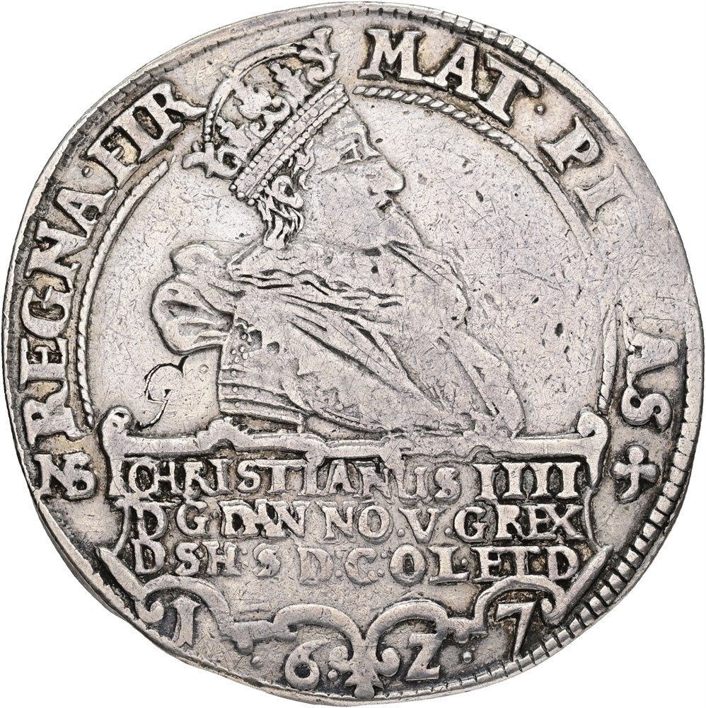 Speciedaler 1627, rand let bearbejdet, graffiti på forsiden.
