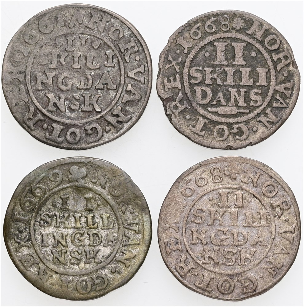 2 skilling 1661, 1668, 1668, 1669. (4)