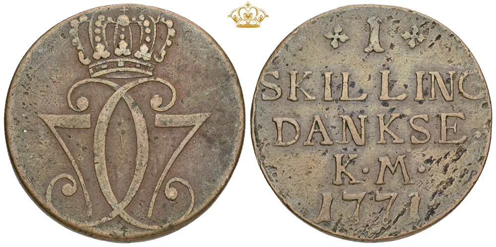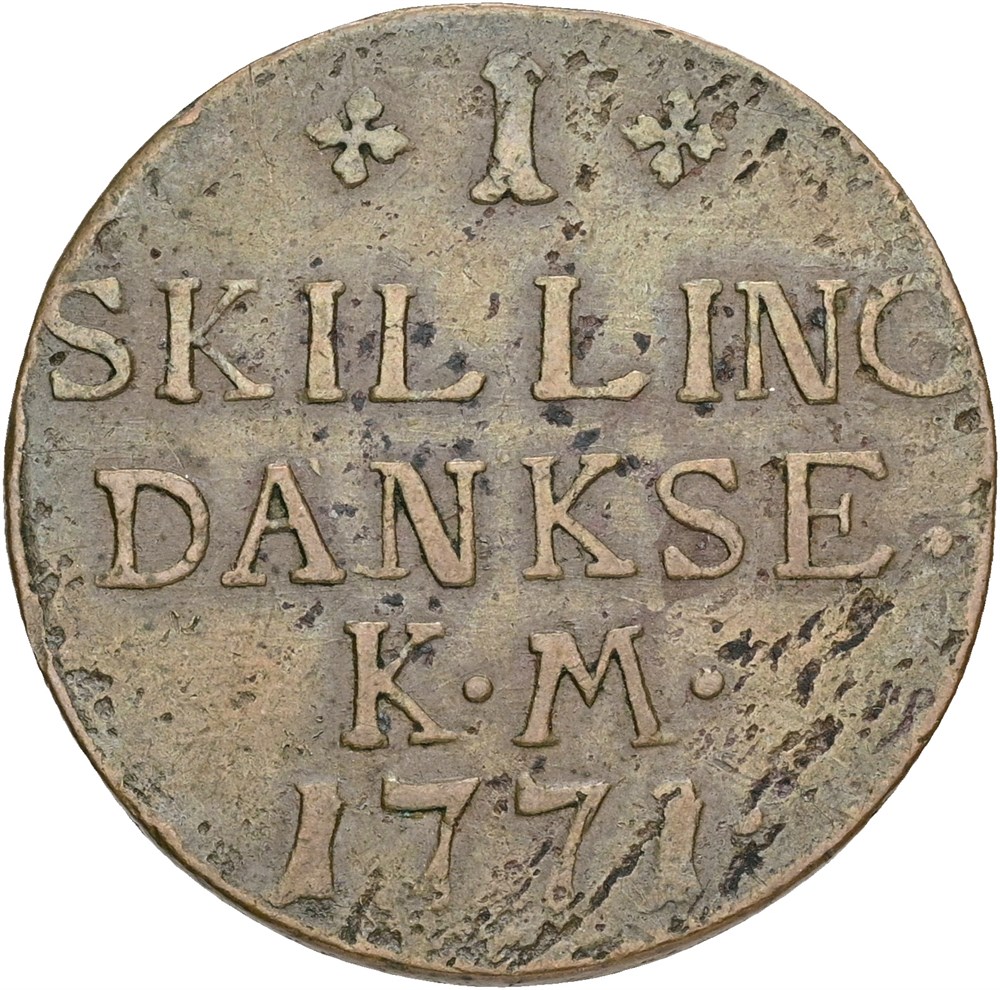 Skilling 1771, fint eksemplar af stavefejlsvarianten 'DANKSE'.