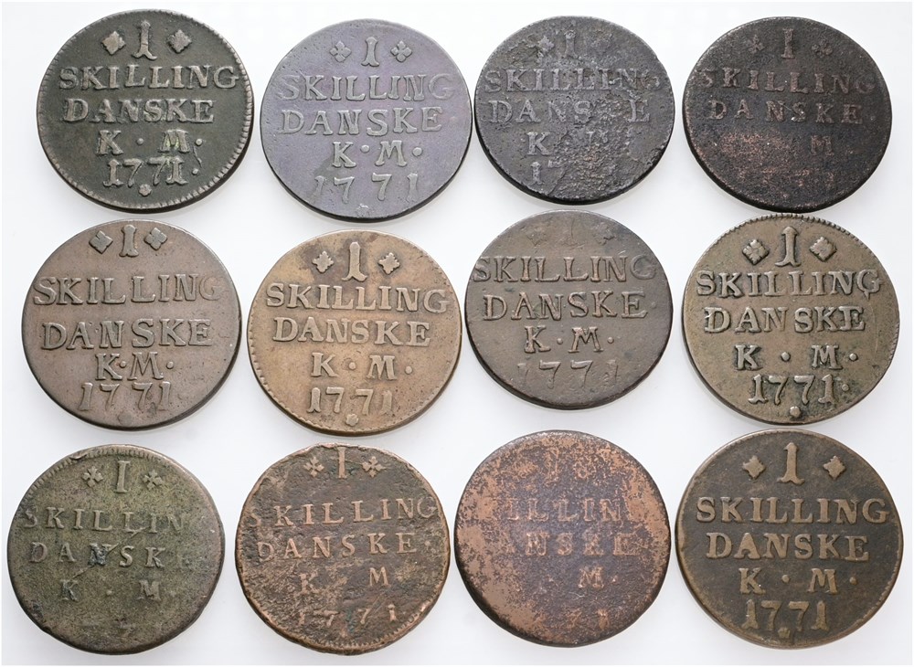 Skilling 1771, 12 stk. inkl. Schimmelmann-varianten (4), og varianten hvor C'erne ruller. (12)