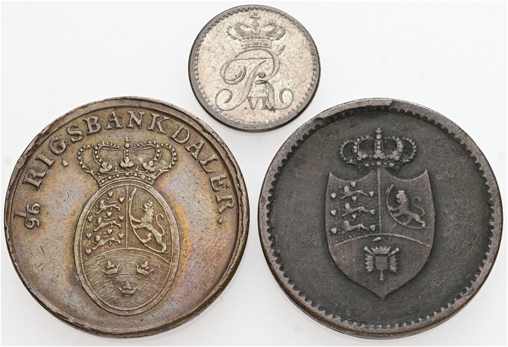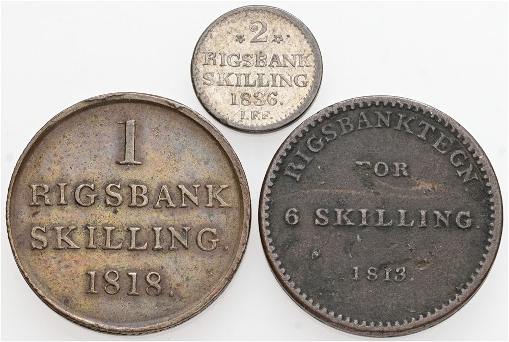 6 skilling 1813; rigsbankskilling 1818; 2 rigsbankskilling 1836. (3)