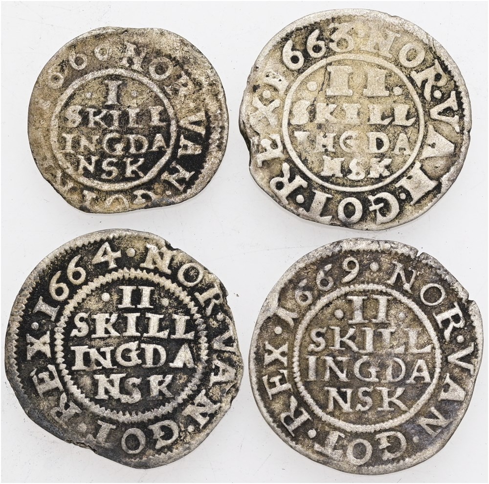 Skilling 1666, 2 skilling 1664, 1666, 1669. (4)