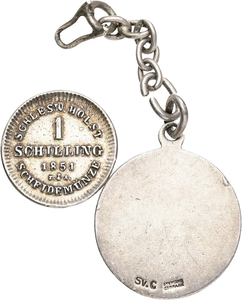 Danmark, Slesvig-Holsten, Oprørsregeringen, schilling 1851, kopi fremstillet af Jørgen Sømod, indslået "KOPI" og "N" i randen; Norge, 48 skilling 1714, ensidig kopi af bagsiden, Ag (925/1000), 22 mm, 6,42 g inkl. kæde. (2)