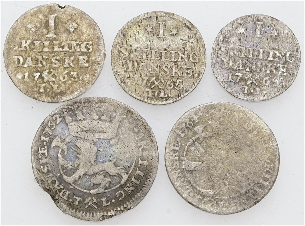 Skilling 1763, 1764, 1765, 2 skilling 1762, 1764. (5)