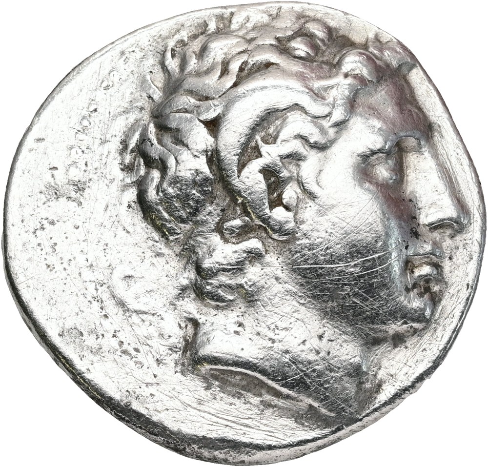 Tetradrachm. Diademed head of Alexander the Great to right with horn of Ammon over his ear / BAΣIΛEΩΣ ΛΥΣIMAXOΥ, Athena seated to left on throne, leaning her left elbow on her shield decorated with lion's head and holding Nike, crowning the king's name, in her right, behind, transverse spear with point below left, bee to left, monogram beneath throne. Cleaned.