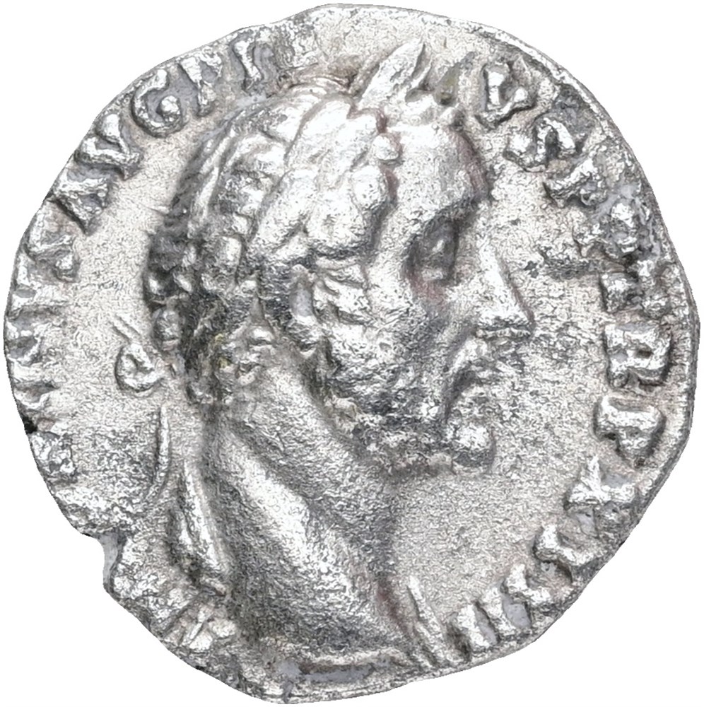 Denarius, Rome. XIIII on obverse, 150-151 AD. Emperor standing left with globe on reverse, COS III. Rare. Cleaned.