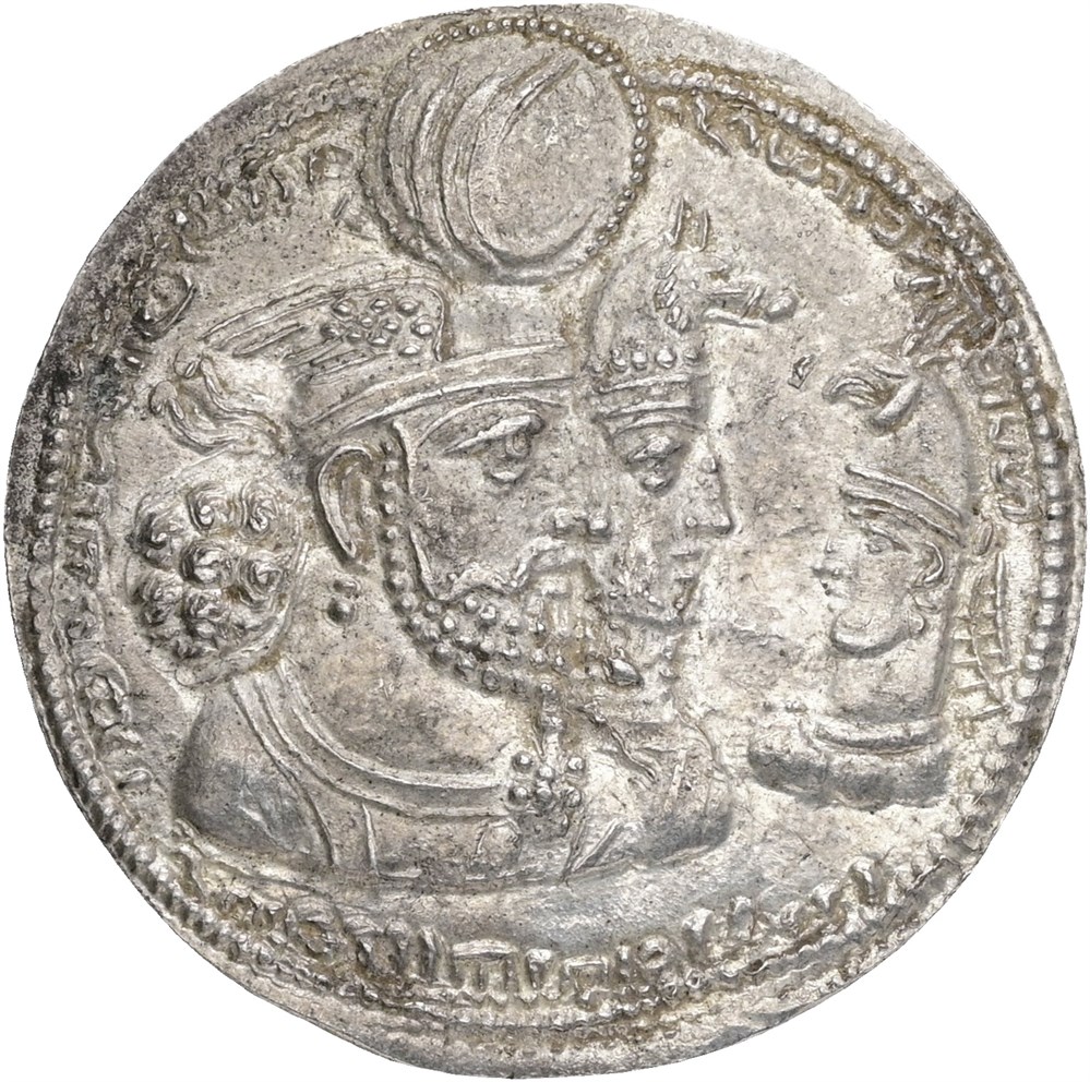 Drachm. King, queen, and prince on obverse. Fire altar between two guardian figures on reverse.