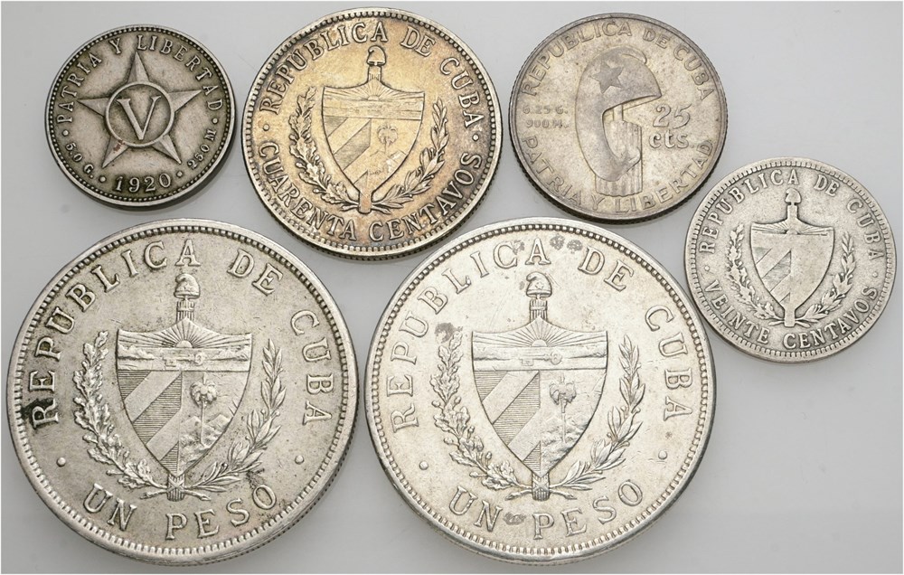 5 Centavos 1920; 20 Centavos 1915; 25 Centavos 1953; 40 Centavos 1920; Peso 1933, 1934. (6)