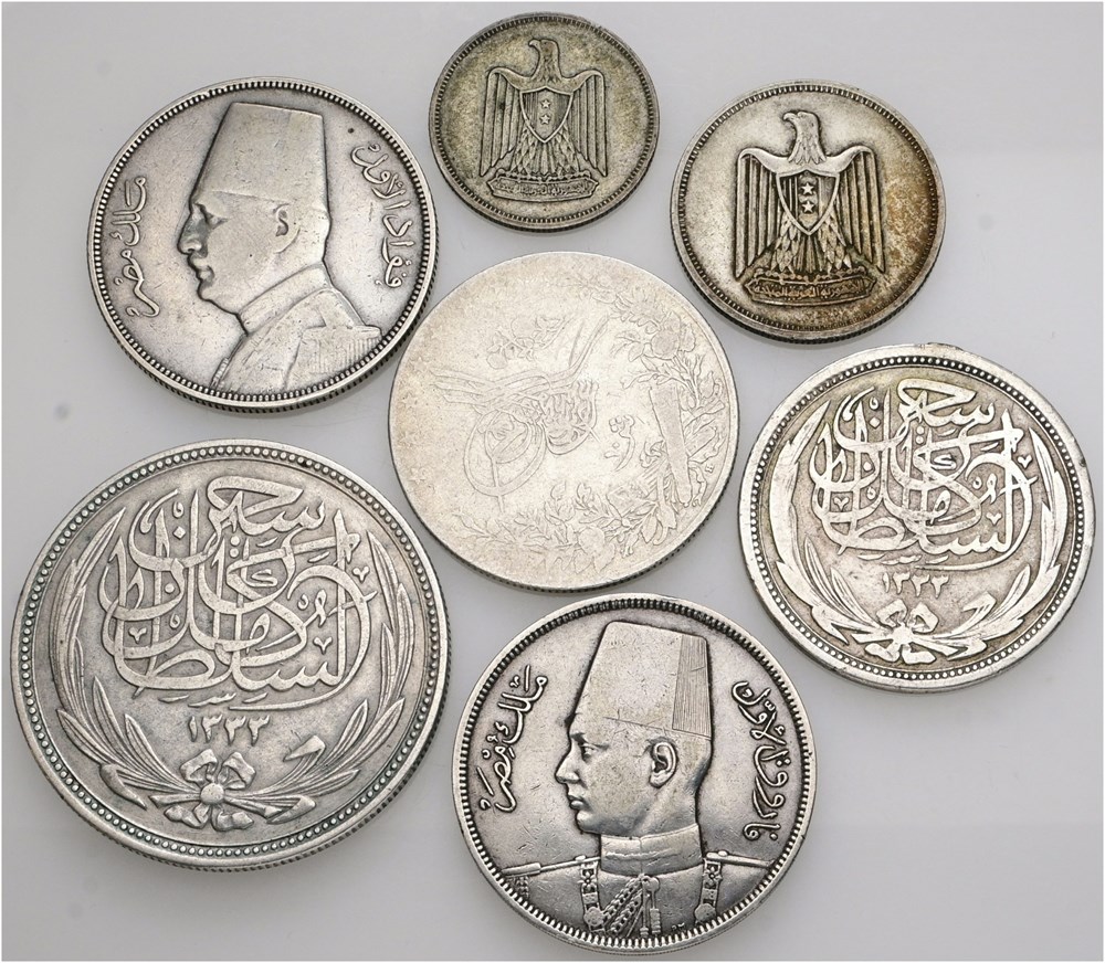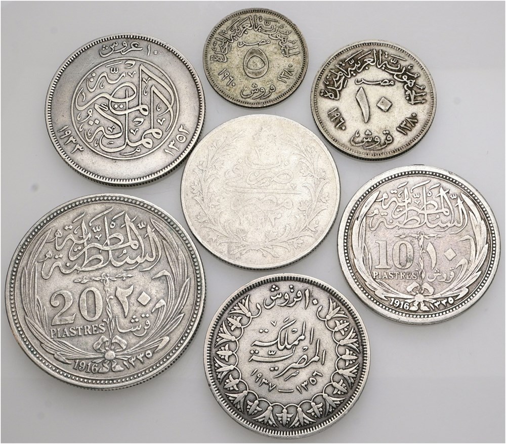 10 Qirsh AH 1293//30 (1904); 5 Piastres 1960; 10 Piastres 1916, 1933, 1937, 1960; 20 Piastres 1916. (7)