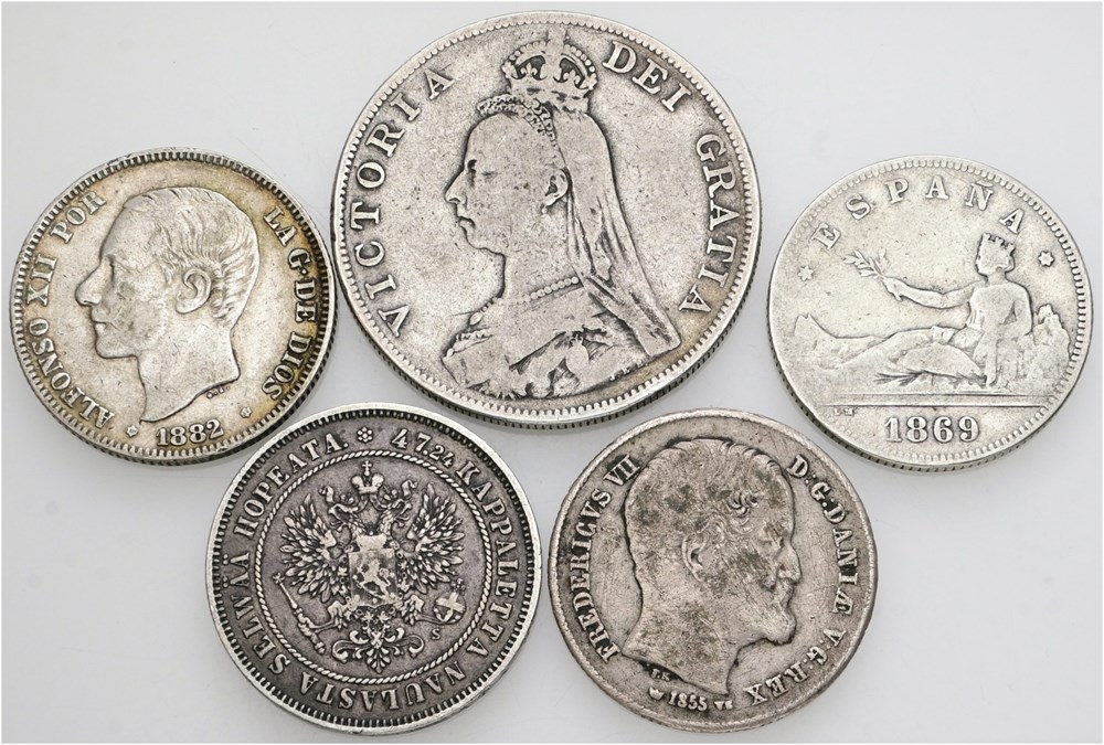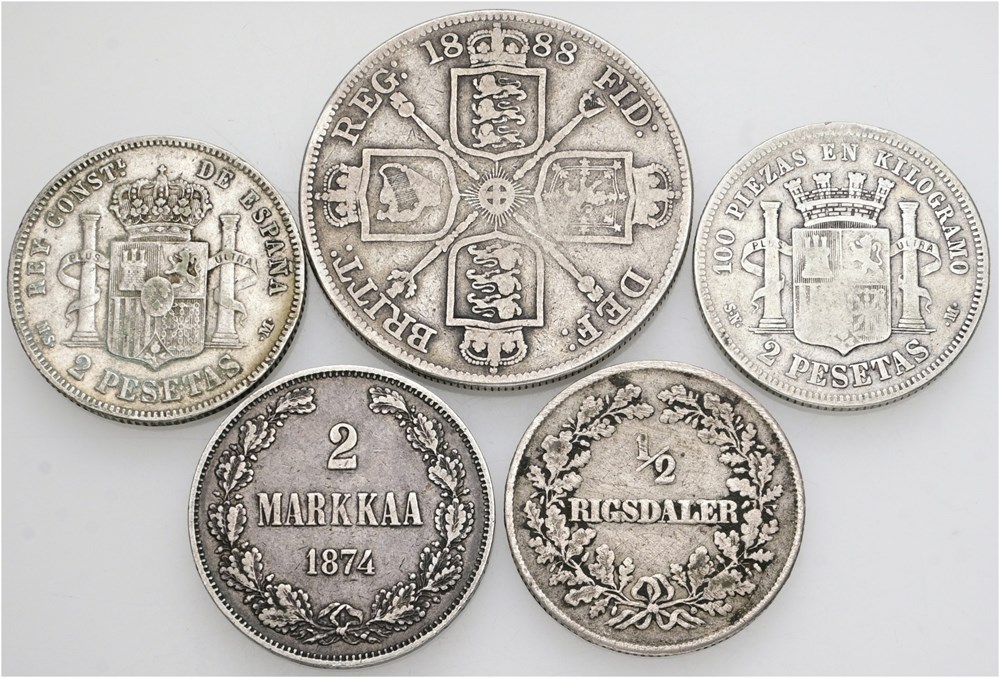 Denmark, 1/2 rigsdaler 1855; Finland, 2 Markkaa 1874; Great Britain, Double Florin 1888; Spain, 2 Pesetas 1869, 1882. (5)