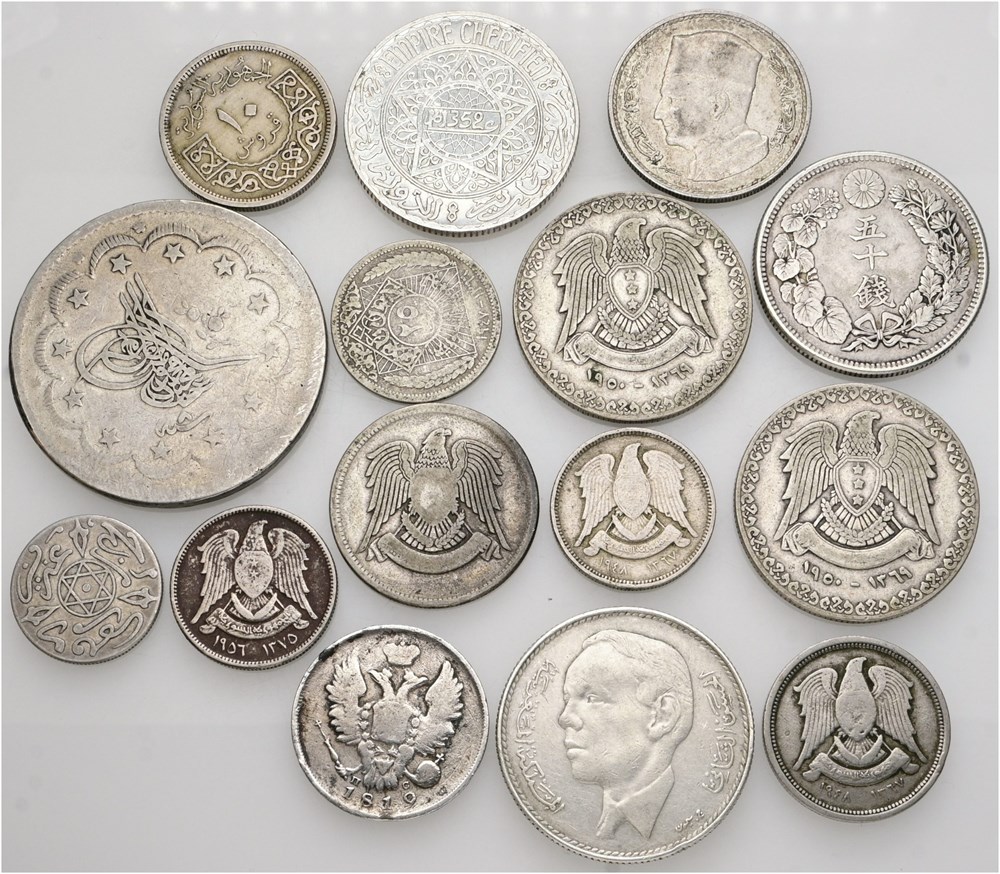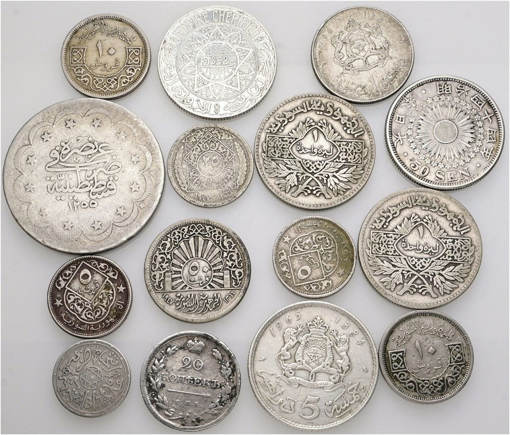 Collection, primarily Ag incl. Japan, 50 Sen year 44 (1911); Russia, 20 Kopecks 1819; Turkey, Ottoman Empire, 20 Kurus AH 1255//8 (1846). In total 15 pcs.