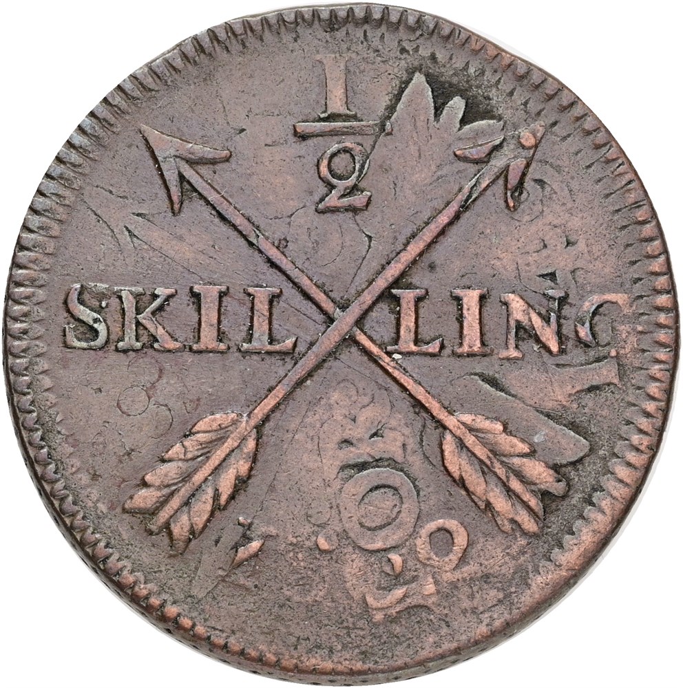 1/2 skilling 1802, overpræget på 1 öre 1749 - ses tydeligt.
