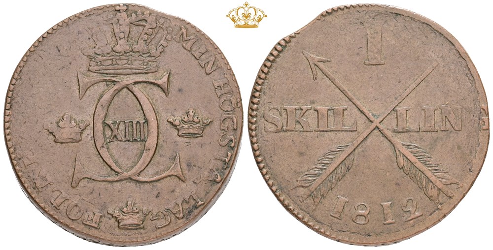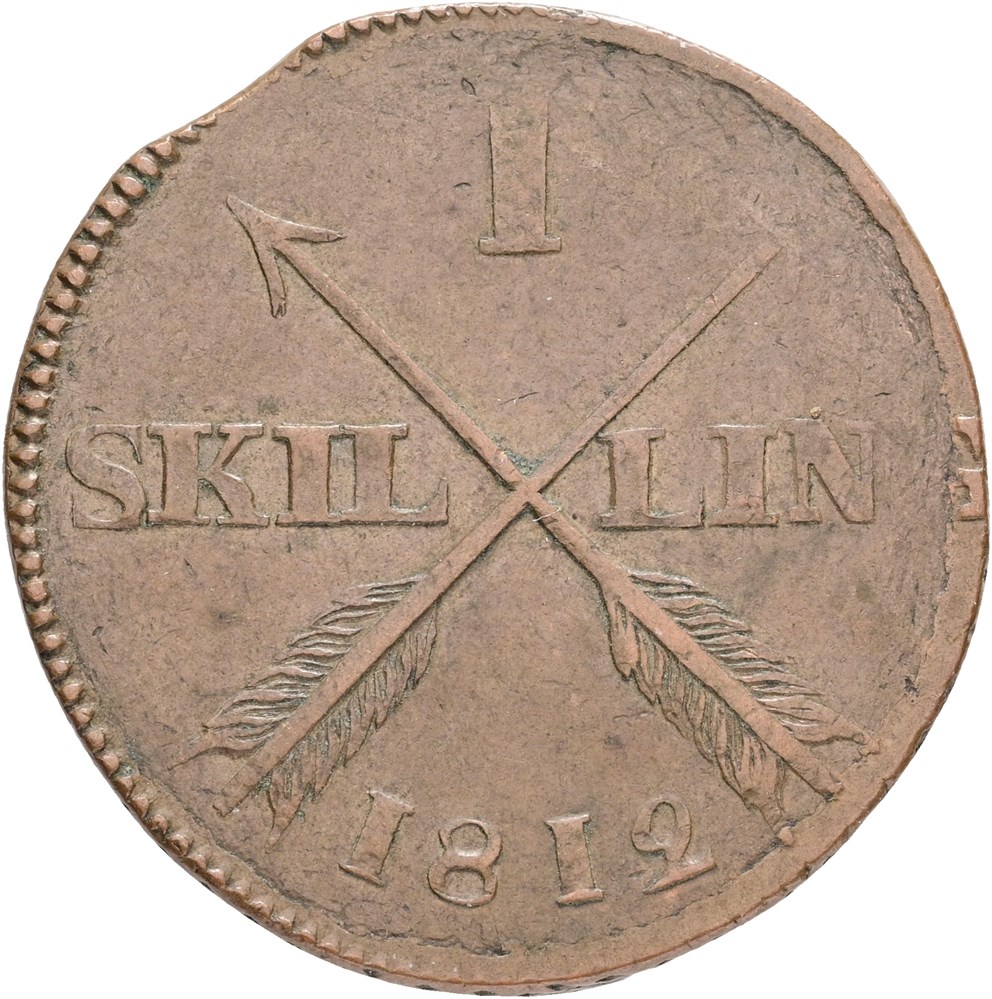 Skilling 1812, lange pilefjer, G præget i perlering, delvist svagt præget.