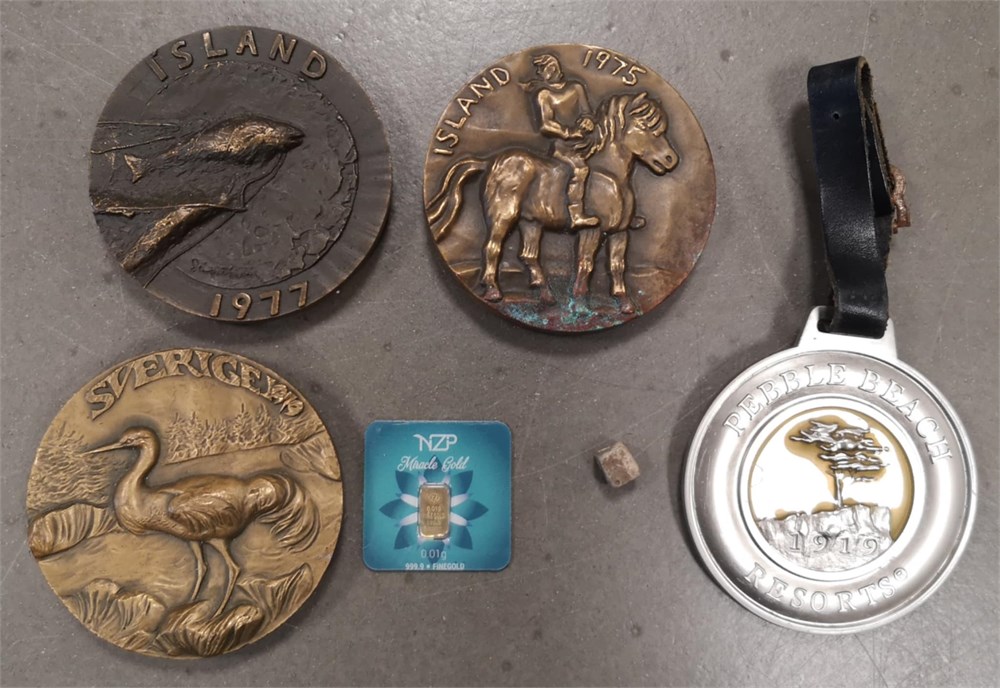 - Guldbarre, 0,01 g, medaljer, terning af bly. (6) (17101028)